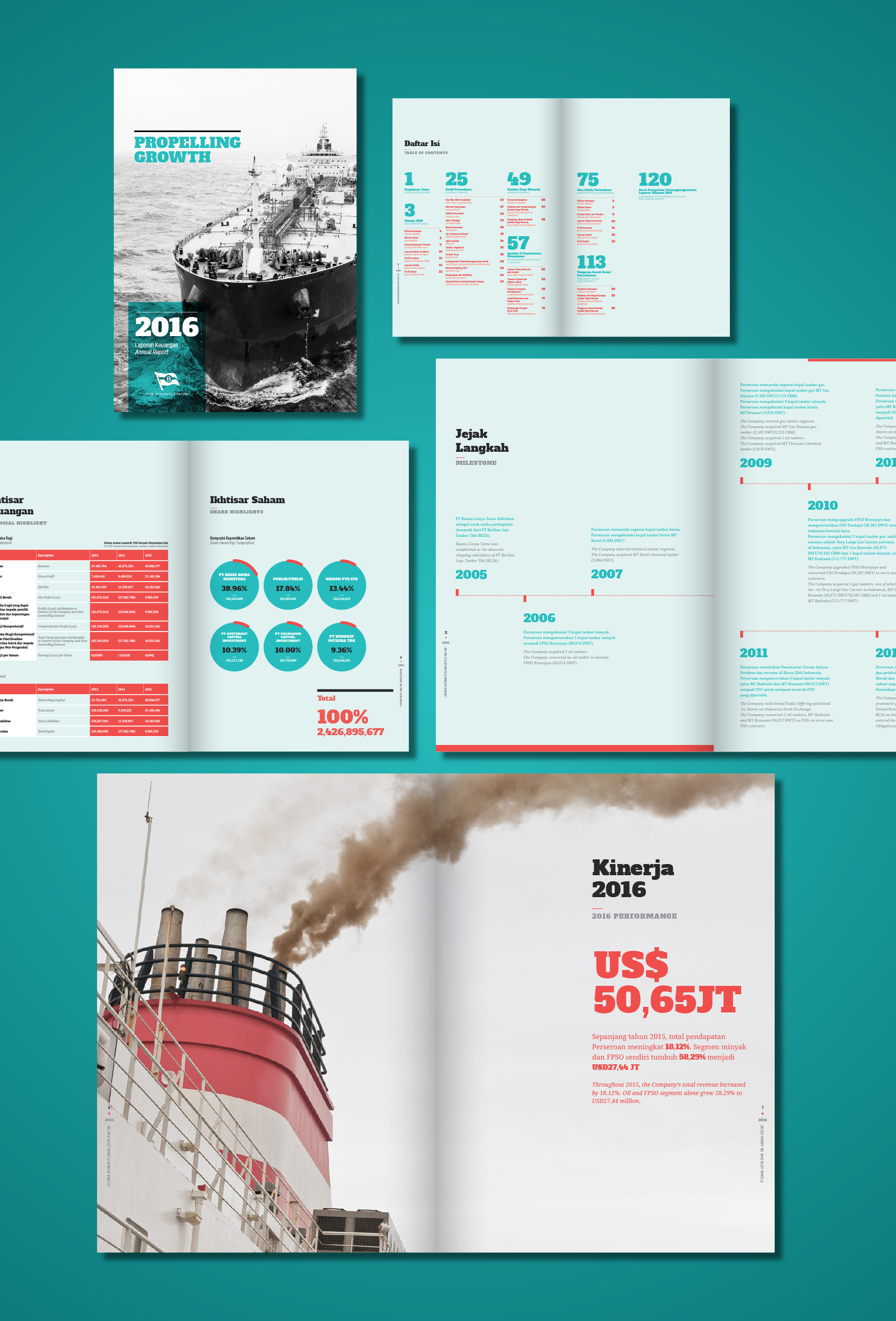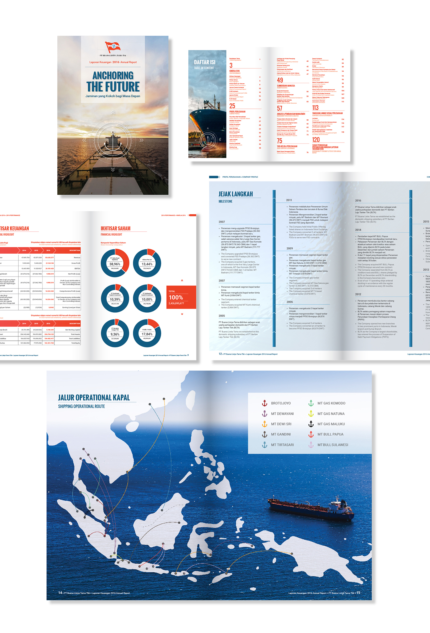 Bold design is exactly what we had in mind for this, as well as certain dramatic photos of large vessels which were selected to enhance the company's brand as a reputable domestic shipping firm in Indonesia.