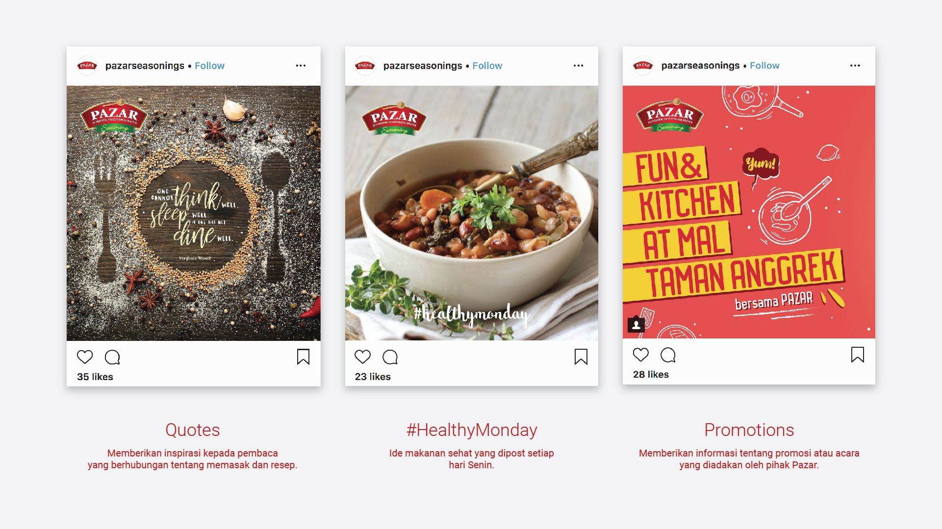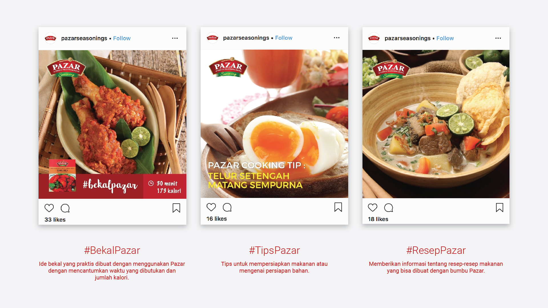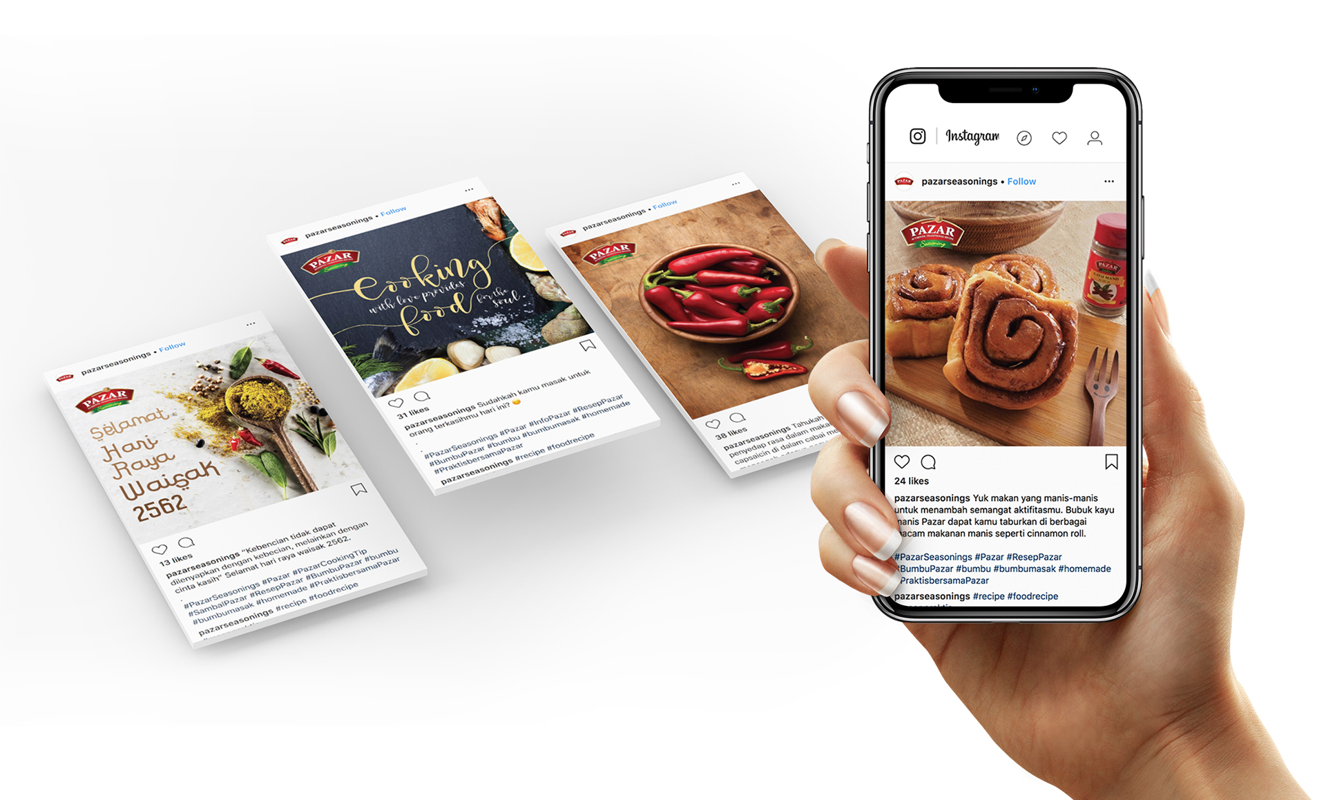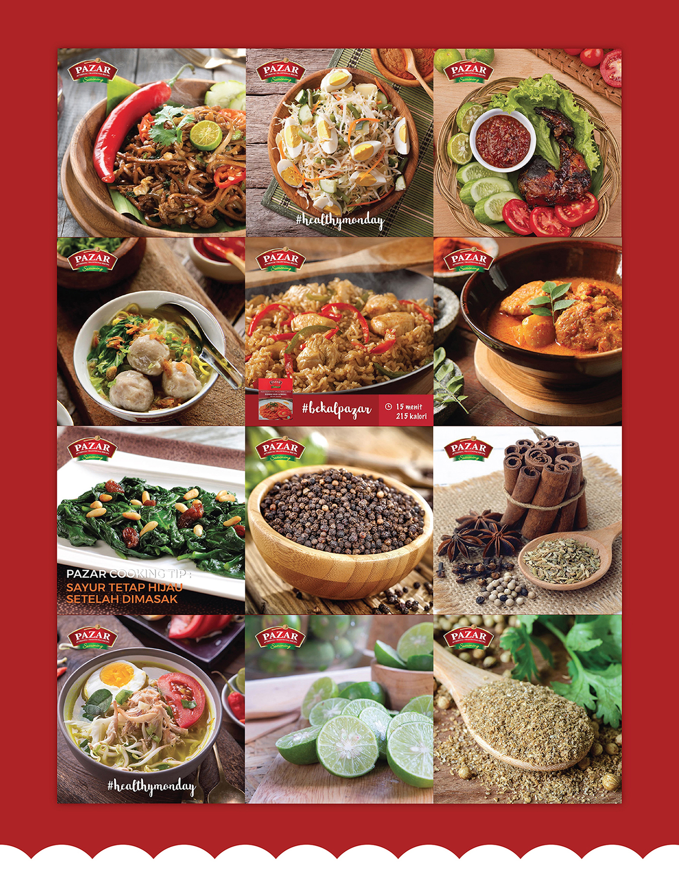 Pazar Seasoning is one of the best seasoning company that provide an authentic texture and taste from fresh ingredients. As seasoning company, Pazar Seasoning have loyal customers who are young housewives living in urban areas with high intensity of social media usage. We suggested our client to boost their brand and promotions through social media (Instagram) with eye-catching design and contextual strategic that suits their customers.